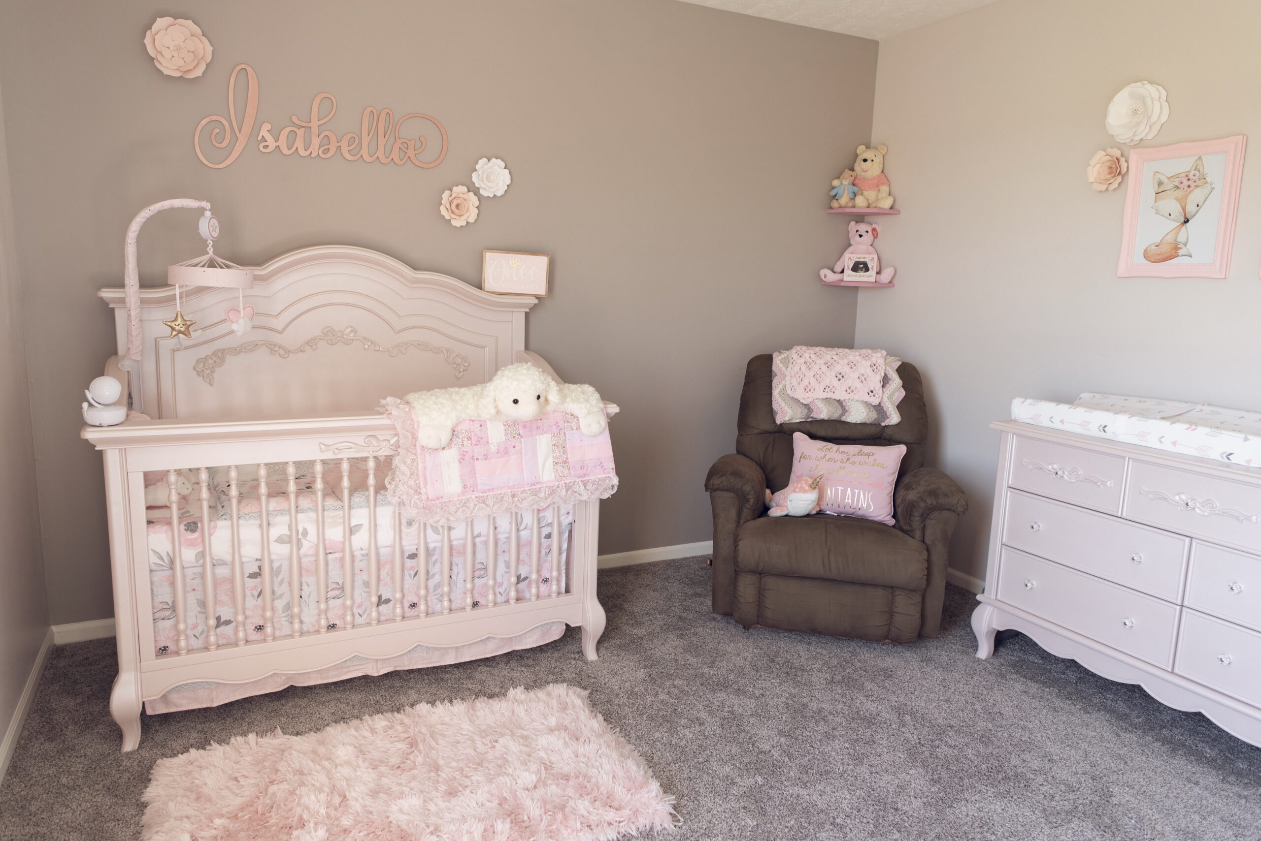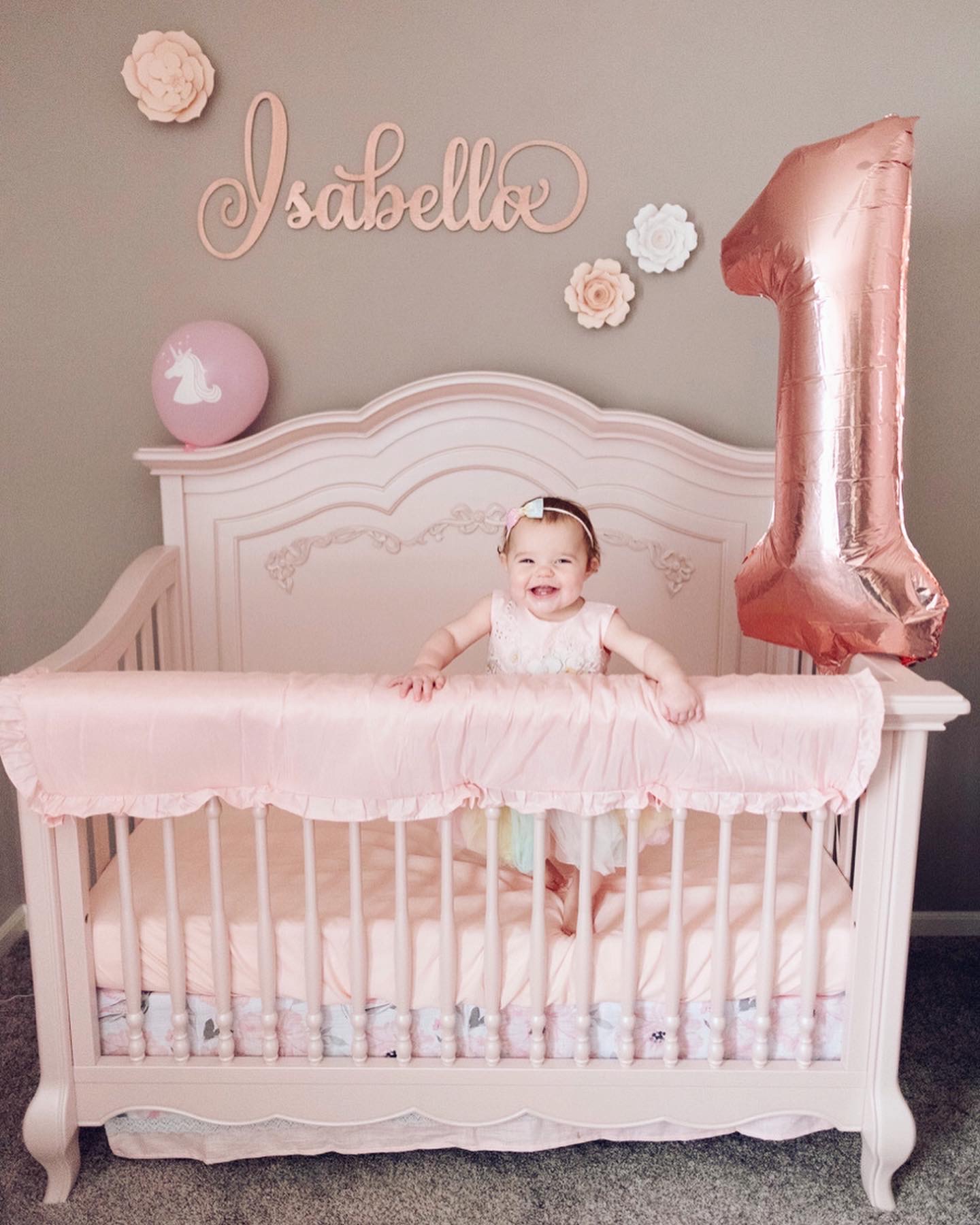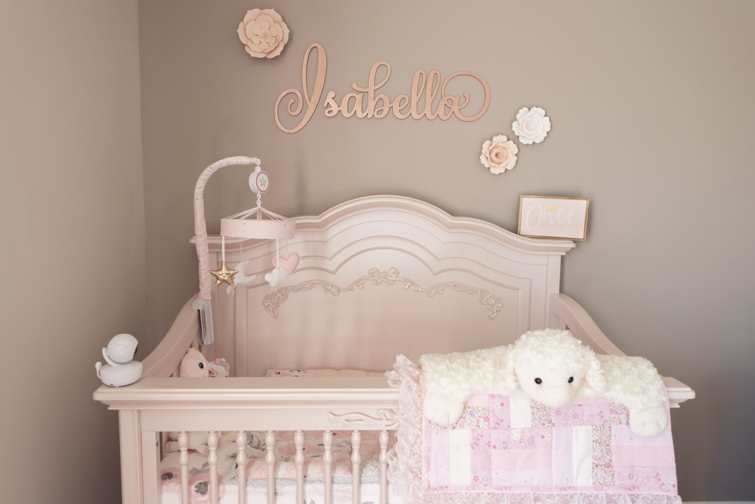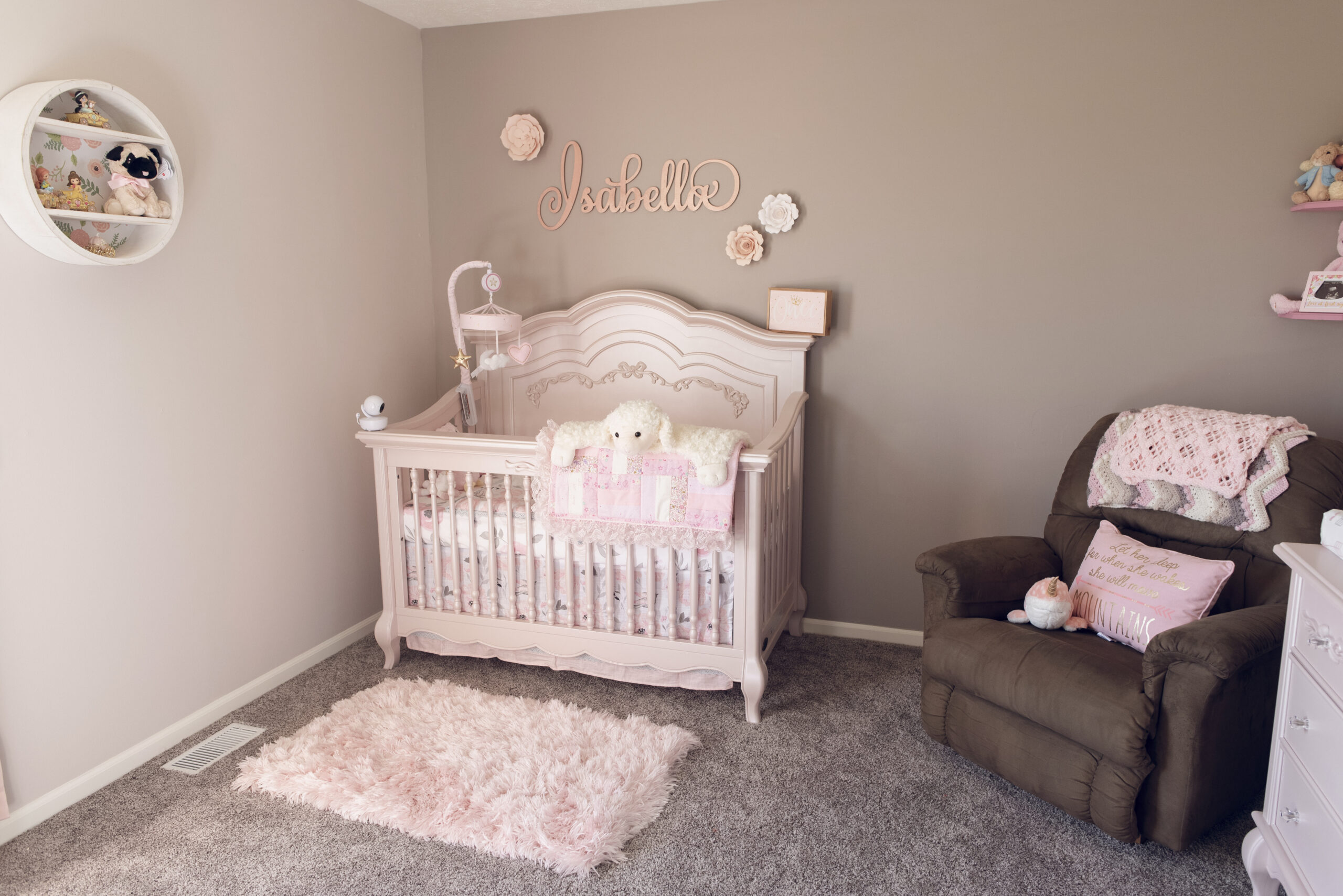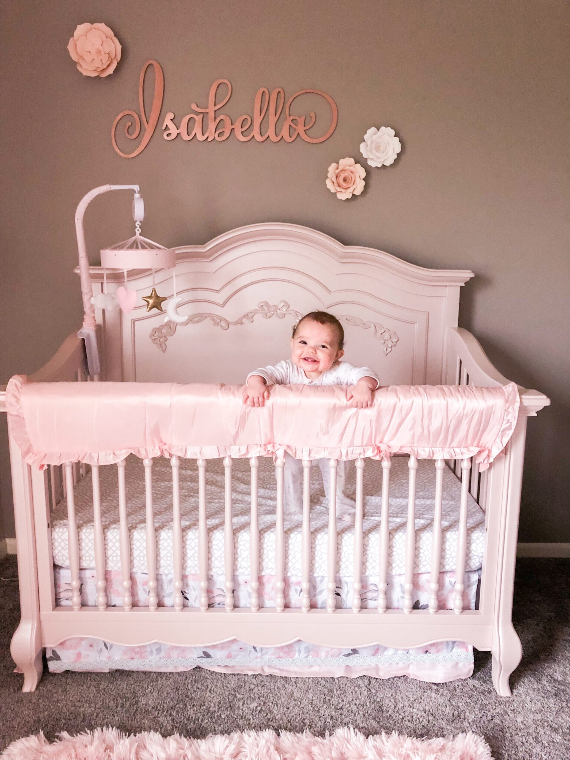 The last feature of Isabella’s Nursery, the 2nd most special part, was her name sign, created by Timeless Notions on Etsy. Like other things, we looked for what felt like months at different options, colors, finishes, fonts and every option you could imagine available on Etsy, until we finally settled on this one. The perfect size. The perfect slightly shimmery rose gold color. We couldn’t be happier with the choice, and hope that it will be a part of Isabella’s room for a very long time.