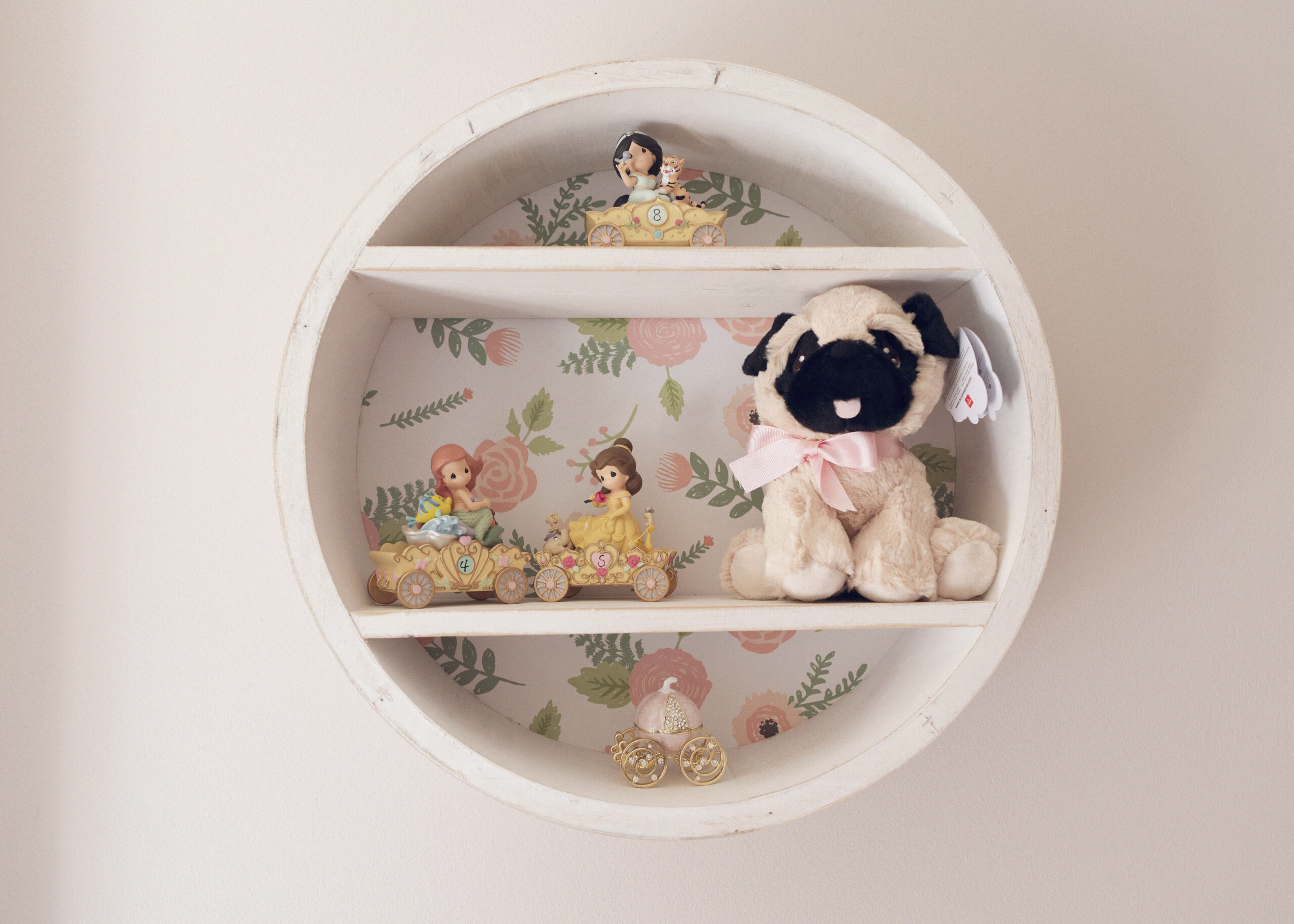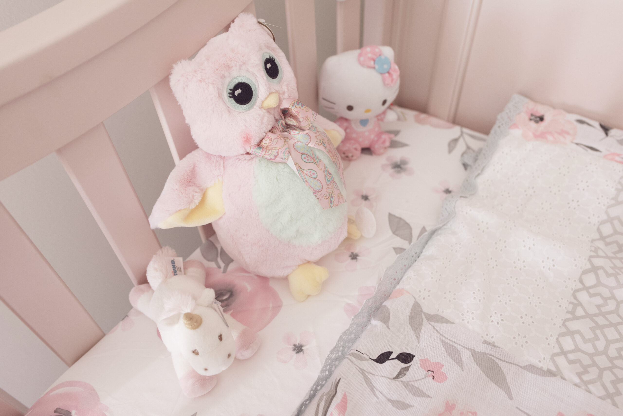 With the addition of stuffed animals that Andrew and I had found years before to save for our someday baby girl, and the sweetest floral accents with her Levtex Crib sheets, paper wall flowers and circle shelf we picked up at Hobby Lobby, it was coming together perfectly.
