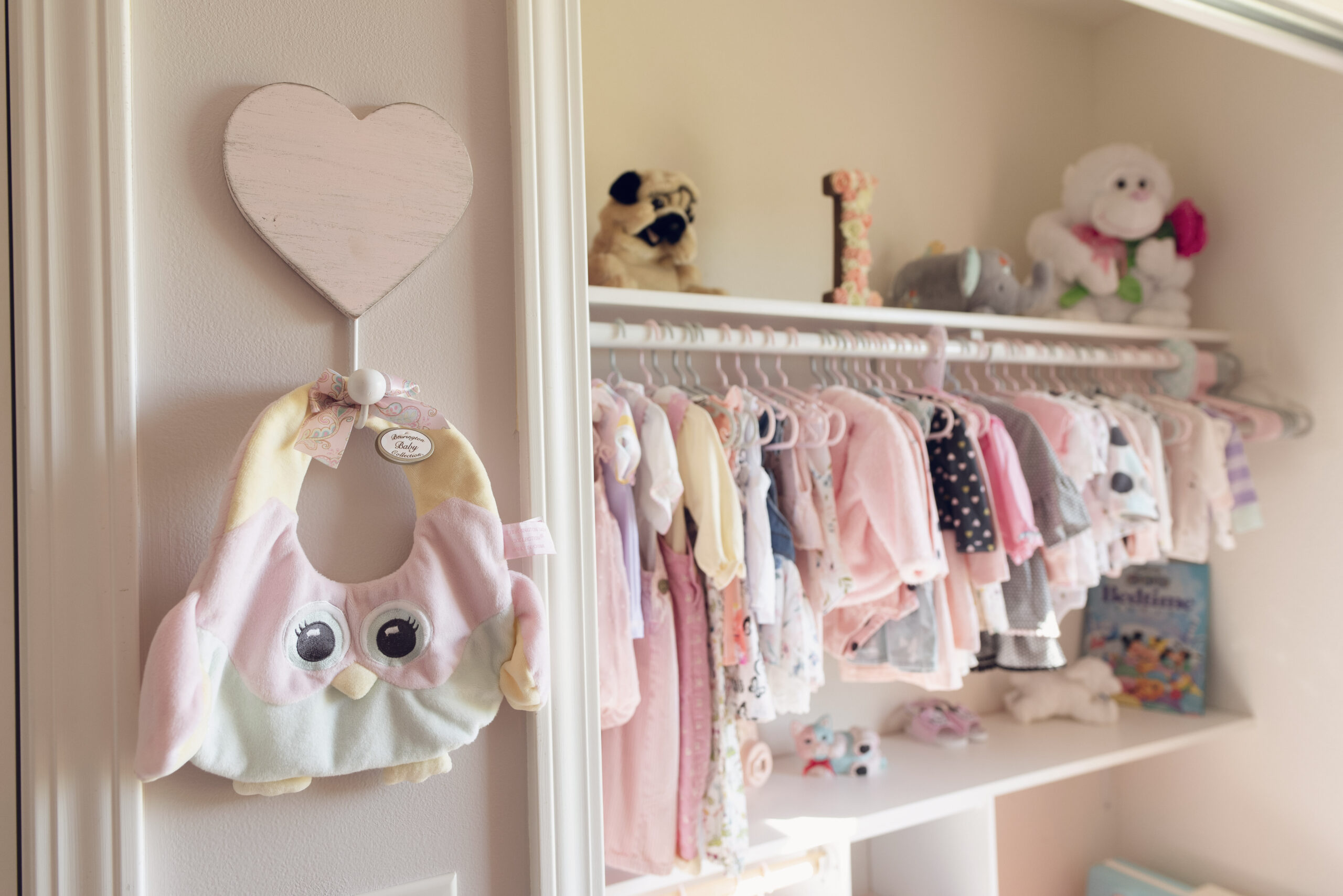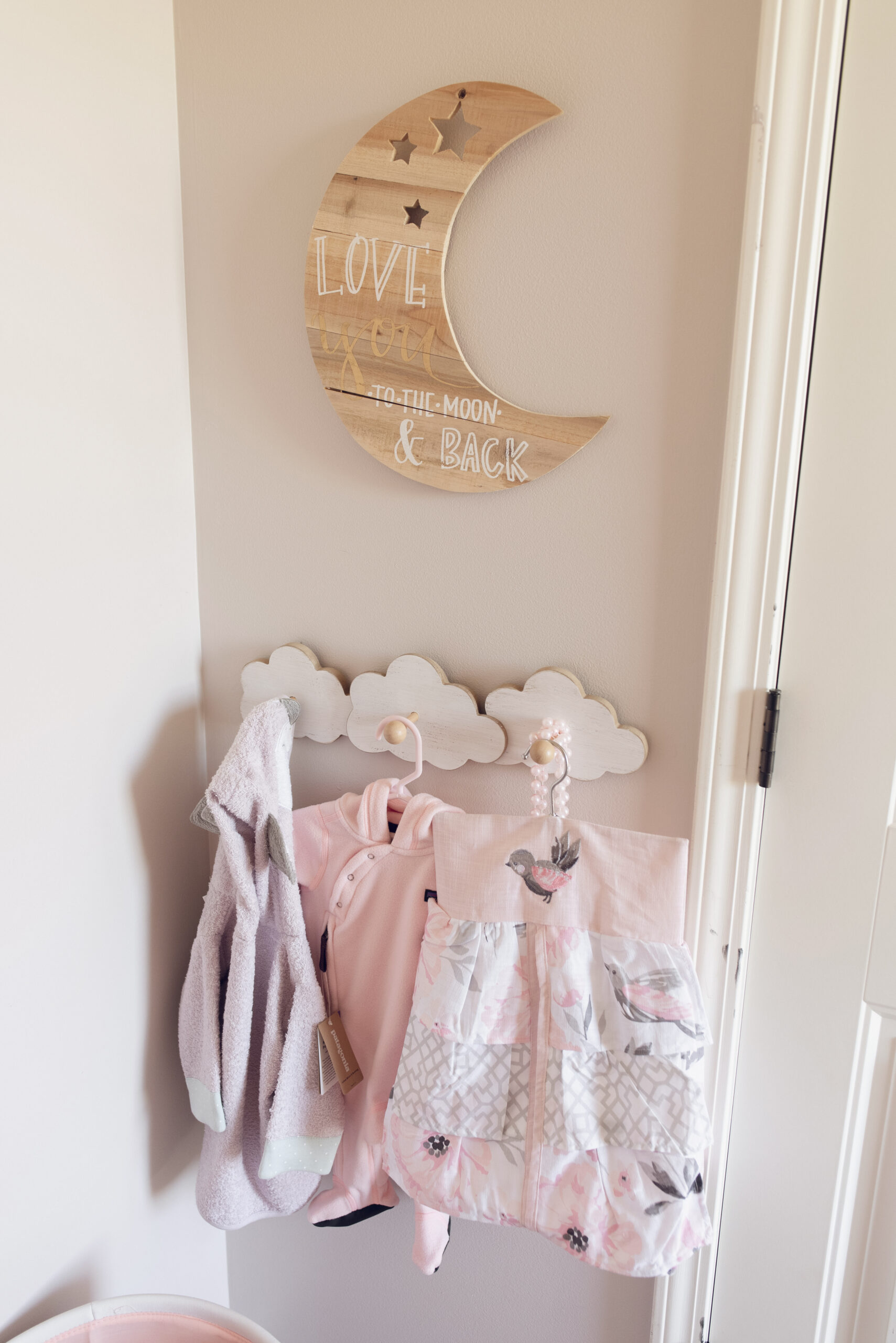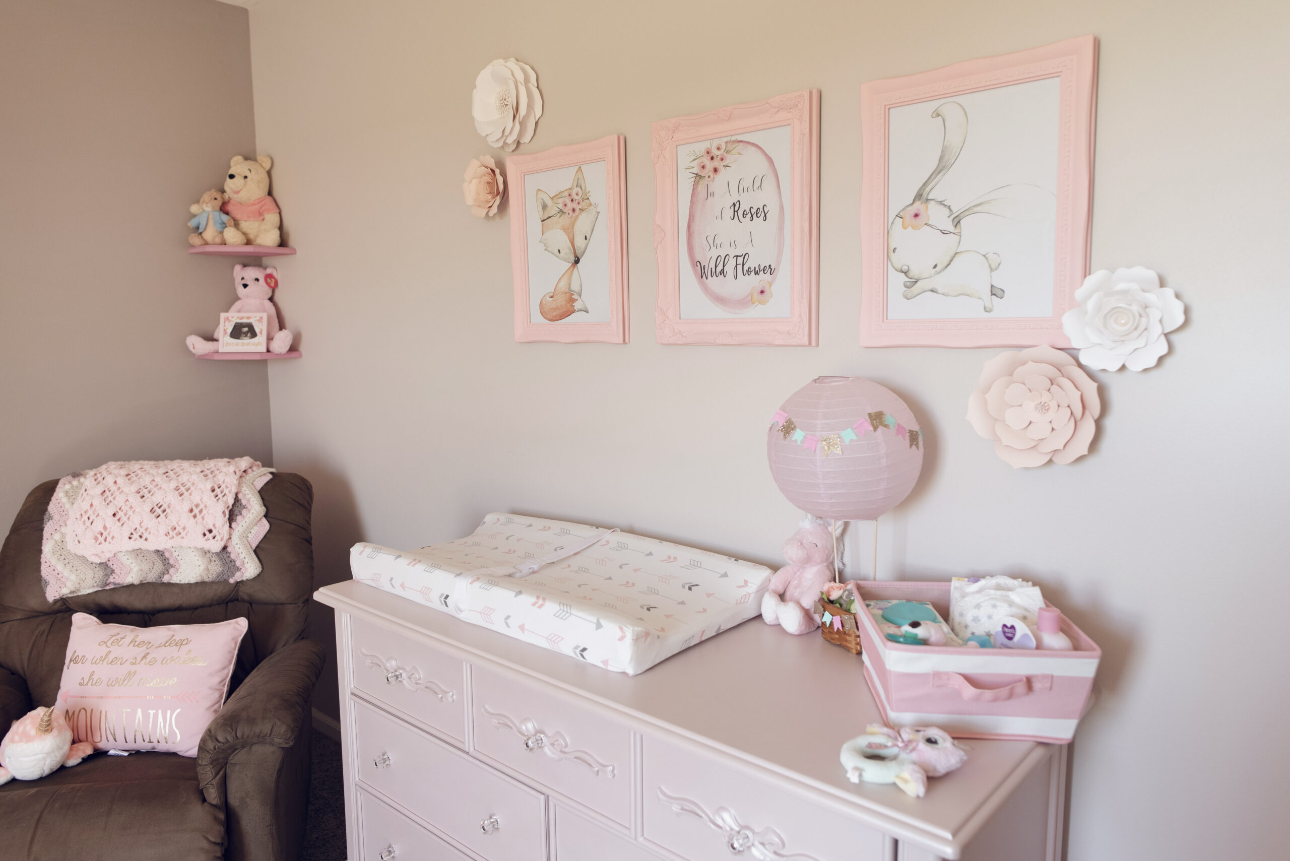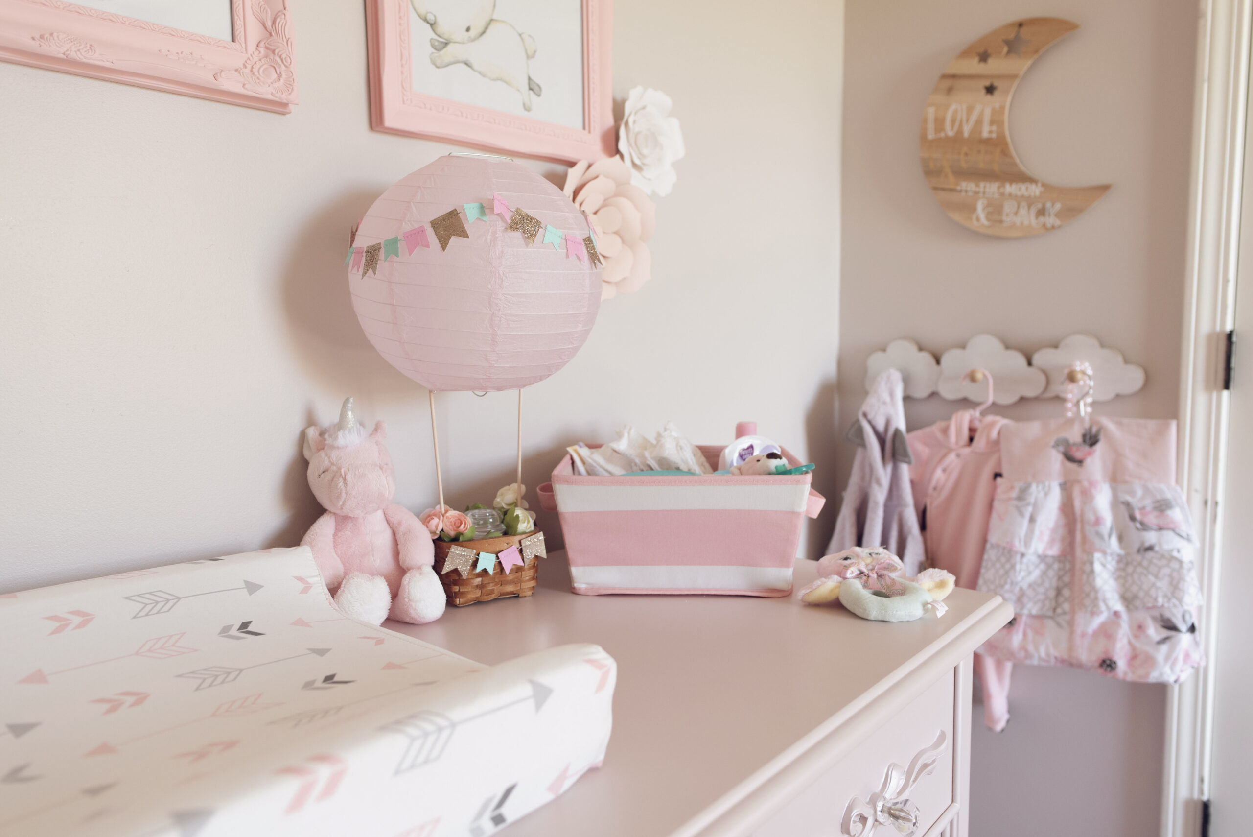 We ended up deciding to DIY a few things such as the adorable baby animal framed images above her dresser, and the organizer in her closet. We even snuck in a couple other DIYs before she arrived as well, creating a little floral letter ‘I’ for a shelf in her closet, and displaying one of the pink hot air balloons I made for my baby shower!