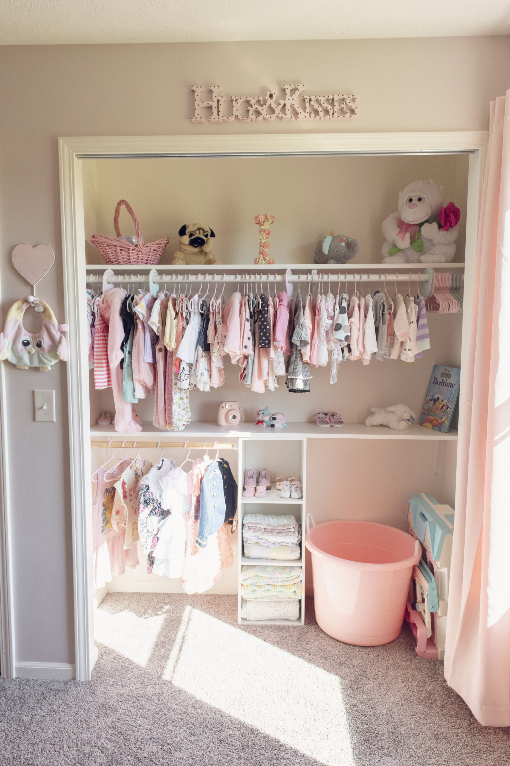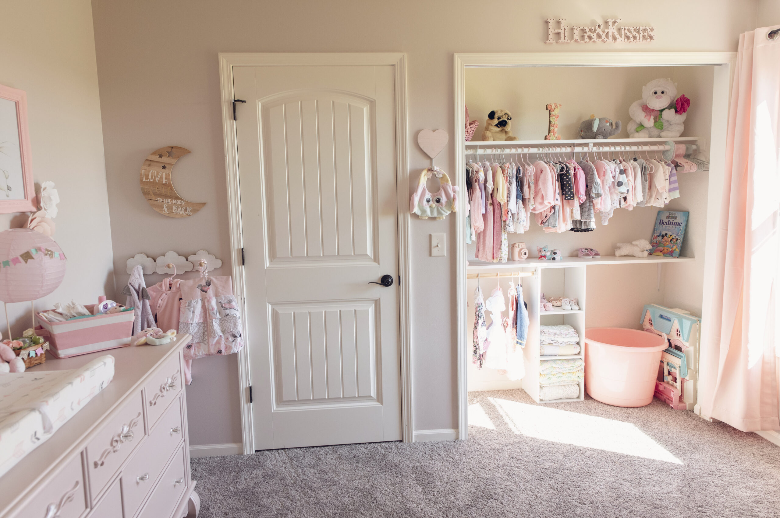 When it came to the closet, a typical one high shelf with a long hanger rod was what we were working with, and it was just not going to cut it up against all the Pinterest baby closets I had been swooning over. Andrew had me pick my favorites and together we came up with the perfect combo. We went to our local Menards and purchased a white 3 tier cube organizer, bought a long white shelf and a plain wood rod. We measured and figured out the placement and Andrew cut down the rod to fit where I wanted it, and installed the shelf. It has been the perfect organizer for Isabella’s closet, and we plan to mimic the look in our other upstairs room in the future for a hopeful second child someday. Also, for no other reason than to keep the room bright and to showcase the pleasing look of adorable baby clothes, and this unique custom organizer, we decided to keep off the closet doors, until she started crawling and needed them back on.